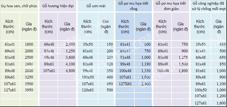 BẢNG GIÁ BÀN THỜ TREO TƯỜNG