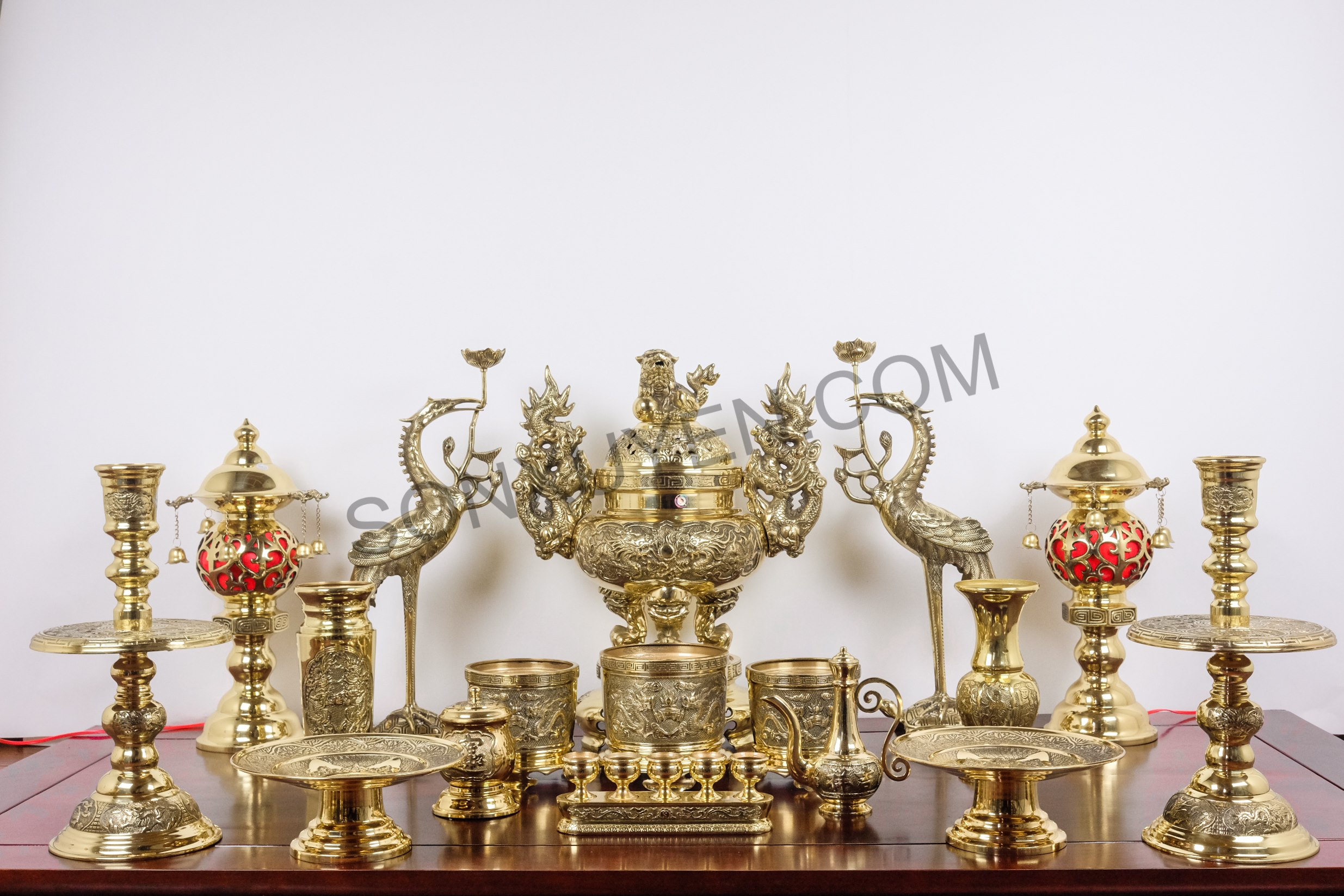 Bộ đồ thờ hoàn chỉnh bằng đồng Đài Loan phù hợp với bàn thờ dài 1m27 đến 1m76. Bao gồm:
