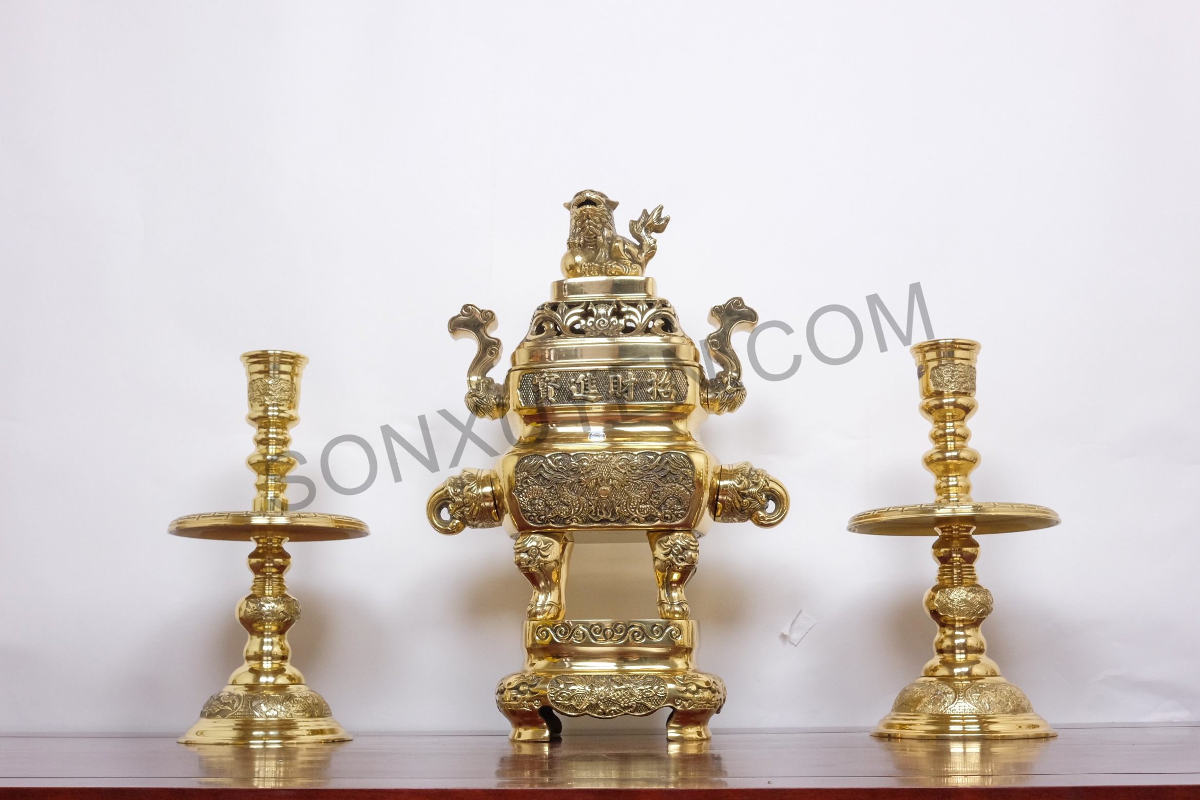 Bộ tam sự đỉnh đồng vàng Đài Loan vuông tai như ý cao 40cm. Công nghệ mới không han gỉ, gồm: