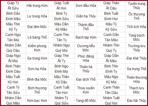 Đầu tiên dùng Lịch Vạn Niên tra Thiên Can và Địa Chi của năm sinh, sau đó tra bảng sau để biết ngũ hành mệnh tuổi